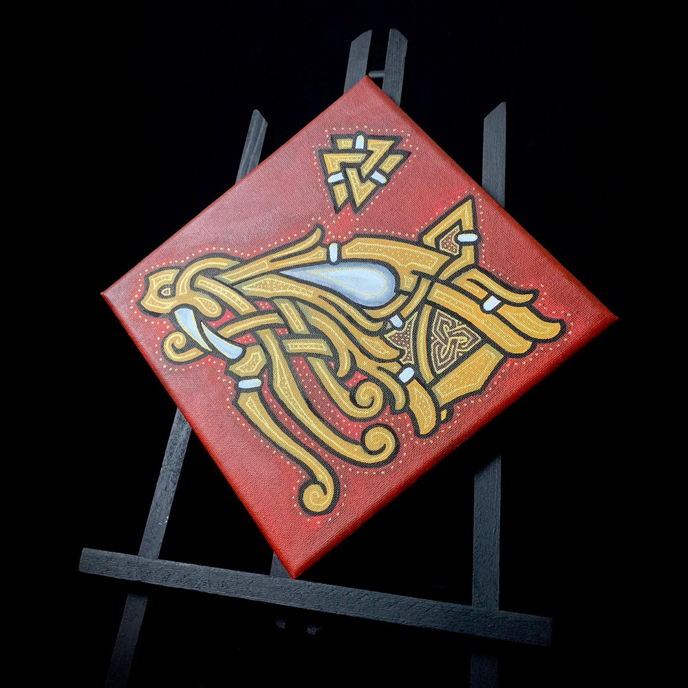 This image is a part of a series of Celtic/Nordic beast heads Sean of Sacred Knot Tattoo created exploring different historical construction methods in the designs. Each of the canvases are unique and hand painted in matt, gloss and metallic paint. This makes the images shimmer in different light and when viewed form different angles.